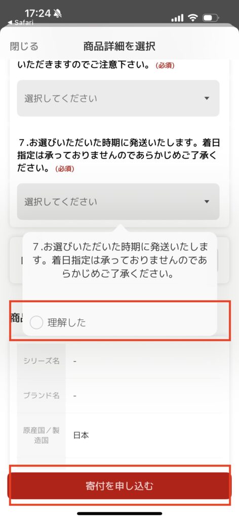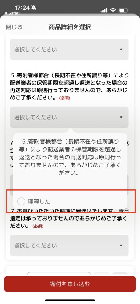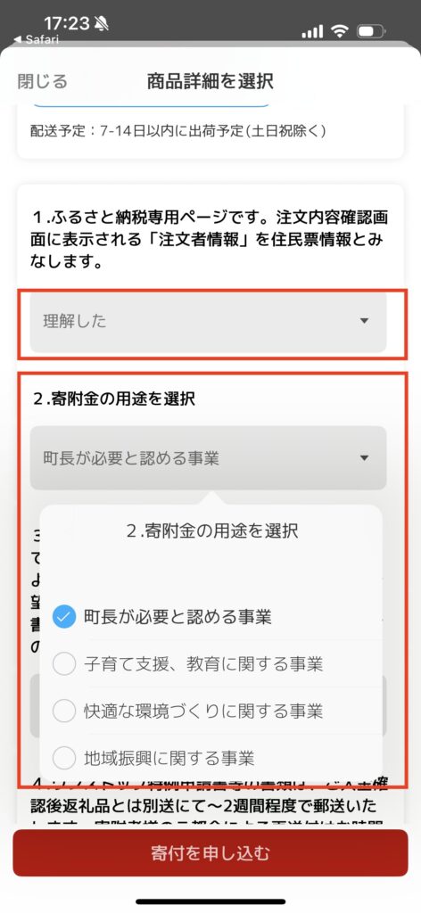商品ページのような画面で「寄付金額」「内容」「配送時期」などが書いてあり、1つ選んで「寄付する」ボタンを押すだけです。