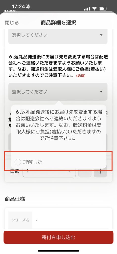 気に入った自治体・返礼品を選んで「カートに入れる→申し込む」で完了です。