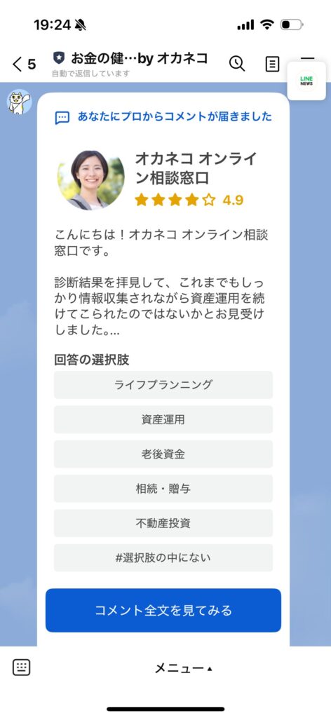 FP相談は、家計ランク診断の後に、LINEでFPさんから直接メッセージが届きます。