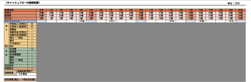 FPさんは、こちらの収入や支出、貯蓄状況をもとに、ライフプラン表(将来のお金の動きが一目でわかるシミュレーション)を作ってくれました。